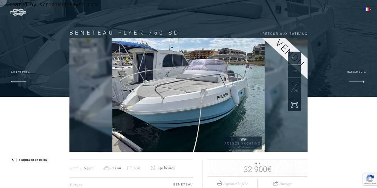 Découvrez le Bénéteau Flyer 750 Sundeck, un bateau polyvalent et élégant, idéal pour les sorties à la journée comme pour les escapades côtières. Doté d’un grand bain de soleil avant, d’un cockpit convivial et d’une cabine confortable avec couchage double, ce modèle allie performance, confort et fonctionnalité. Motorisé en YAMAHA hors-bord 250 CV, il offre une navigation agréable et sécurisée, aussi bien en famille qu’entre amis.