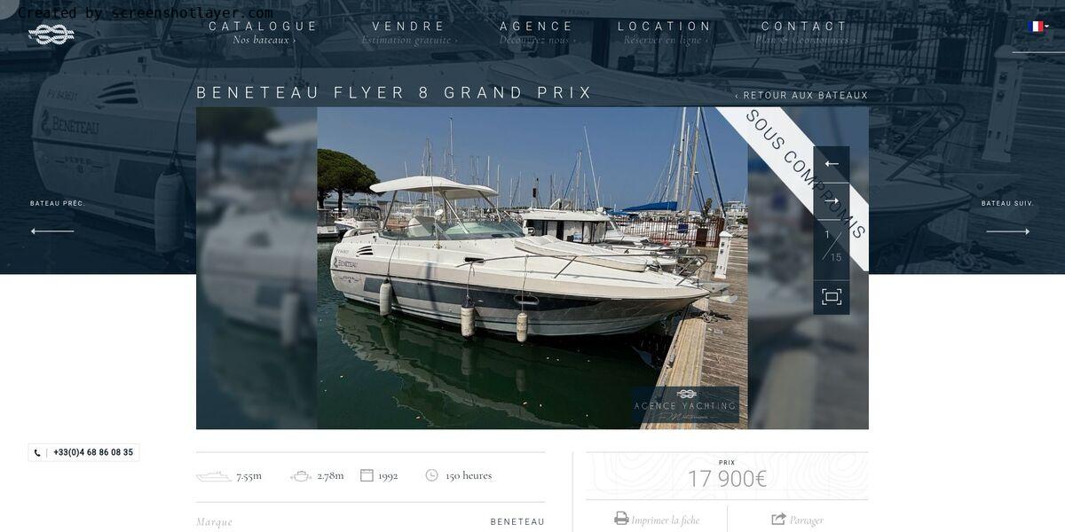 Le Bénéteau Flyer 8 Grand Prix de 1992 est un day-cruiser sportif et élégant, taillé pour les amateurs de navigation rapide et confortable. Sa carène en V évolutif offre une excellente tenue en mer et un passage en douceur dans le clapot. Spacieux et fonctionnel, il dispose d’un cockpit convivial ainsi que d’une cabine permettant les sorties prolongées. Équipé d’une motorisation performante, il allie plaisir de pilotage et fiabilité, dans la pure tradition Bénéteau des années 90.
