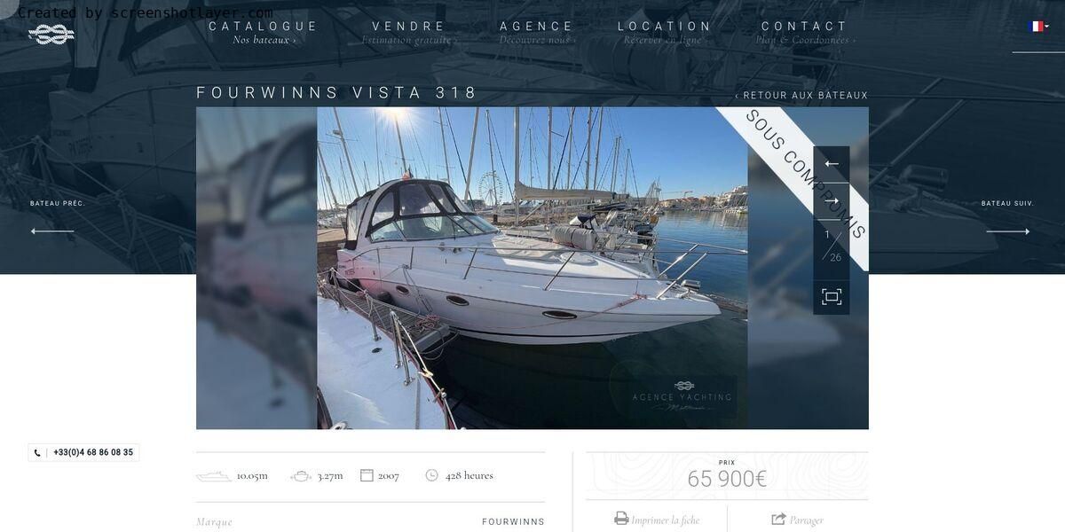 Le Four Winns Vista 318 est un cruiser de 10,05 mètres qui combine performance, confort et style. Équipé de deux moteurs puissants, il offre une navigation dynamique et stable, idéale pour des escapades en mer, que ce soit pour des journées de détente ou des croisières plus longues. Son design moderne et ses finitions soignées se retrouvent aussi bien à l'extérieur, avec un grand cockpit convivial, qu'à l'intérieur, où il propose un salon lumineux, une cuisine équipée, une cabine spacieuse et une salle de bain, pour un confort optimal. Le Vista 318 est le choix parfait pour ceux qui recherchent un bateau polyvalent, performant et agréable à vivre.